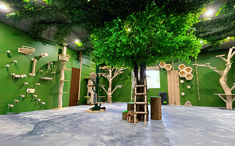 This package is a cozy-sized studio. It provides a private space where cats can relax comfortably, designed to shield them from outside disturbances. This area offers a safe haven for cats to enjoy time on their own. We've equipped the space with premium cushions and toys to enhance comfort, prioritizing each cat’s rest and sense of security.